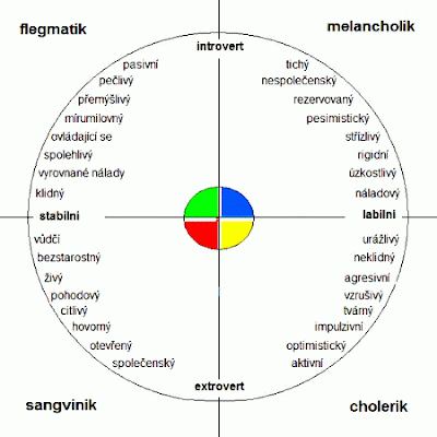 ženský už hlavní lajnu popsaly, tak jenom dodám, že introverti jsou melancholici(lidé emočně labilnější) a flegmatici(emočně stabilnější), extroverti se dělí na sangviniky(emočně stabilnější) a choleriky(emočně labilnější)